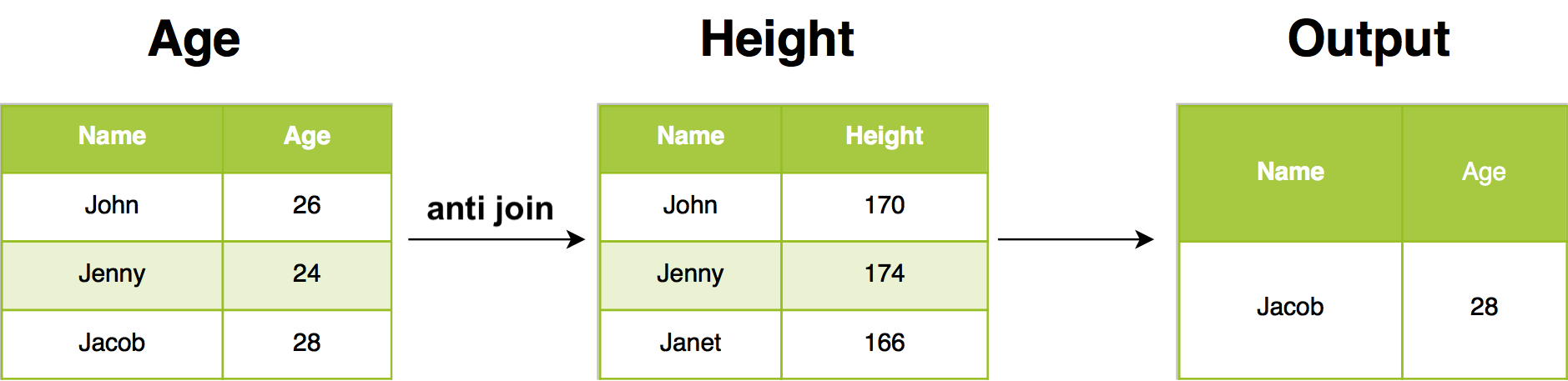 Anti joins are useful for diagnosing join mismatches. In our example, anti join return all rows from Age where there are not matching values in Height, keeping just columns from Age.