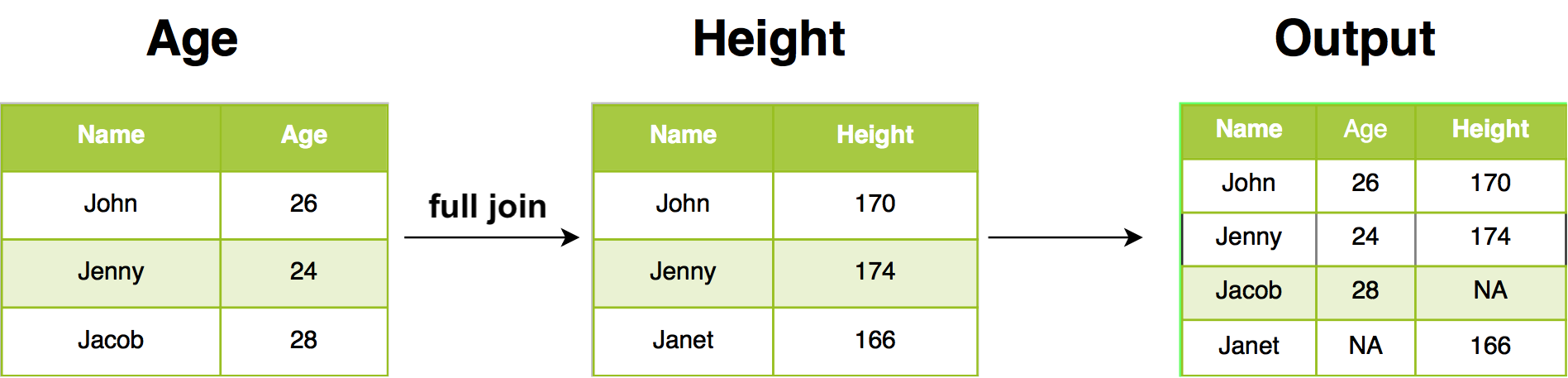 Full join return all rows and all columns from both Age and Height. Where there are not matching values, returns NA for the one missing.