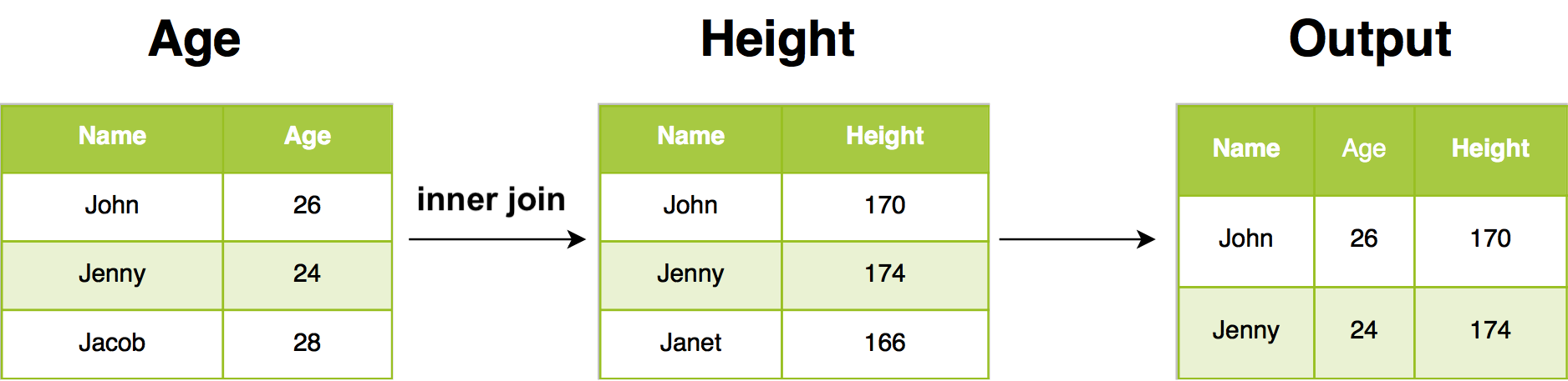 Inner join will return all rows from Age where there are matching values in Height, and all columns from Age and Height. If there are multiple matches between Age and Height, all combination of the matches are returned.