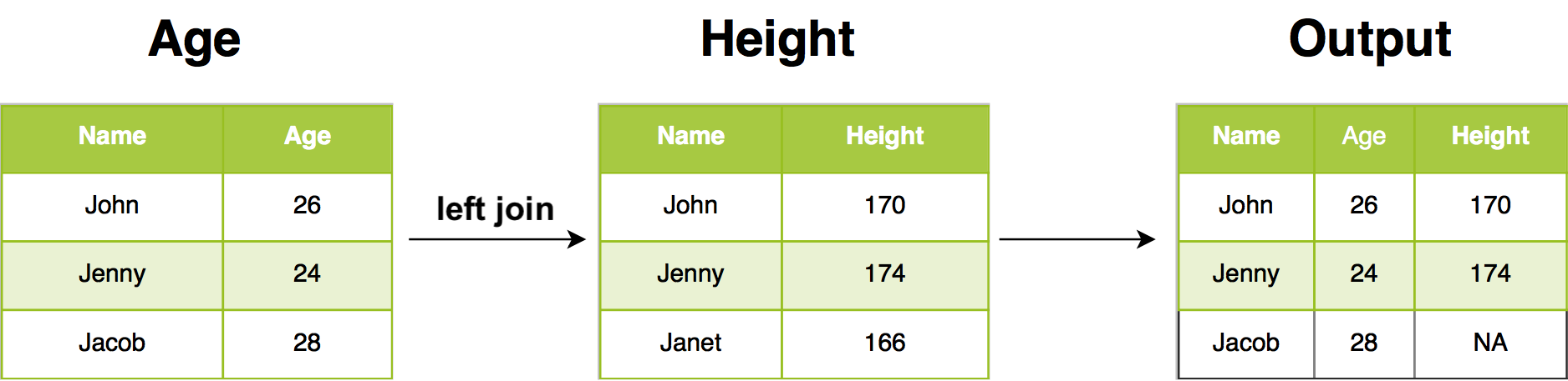 In our example, left join return all rows from Age, and all columns from Age and Height. Rows in Age with no match in Height will have NA in the new columns. If there are multiple matches between Age and Height, all combinations of the matches are returned.