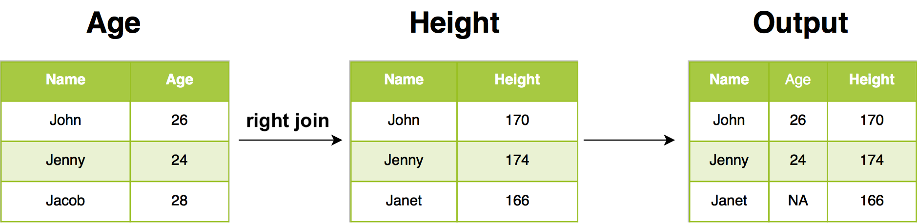 In our example, right join return all rows from Height, and all columns from Age and Height. Rows in Height with no match in Age will have NA in the new columns. If there are multiple matches between Age and Height, all combinations of the matches are returned.