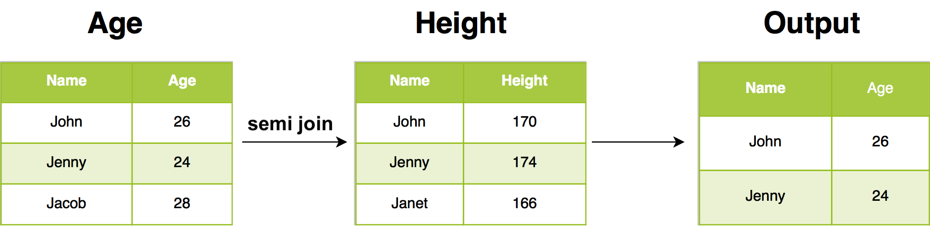 For example, semi join return all rows from Age where there are matching values in Height, keeping just columns from Age. A semi join differs from an inner join because an inner join will return one row of Age for each matching row of Height, where a semi join will never duplicate rows of Age.