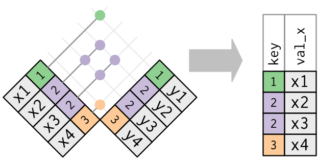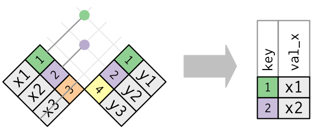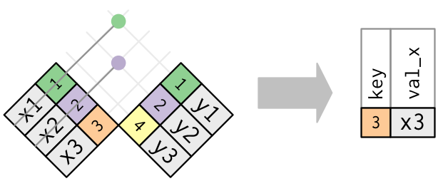 semi_join(x, y)keeps all observations inxthat have a match iny.anti_join(x, y)drops all observations inxthat have a match iny.
