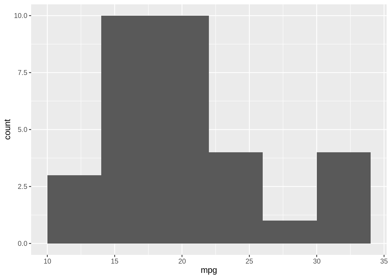 Histograms are used to visualize the distribution of a quantitative variable, i.e., all its possible values and how often they occur over different intervals. It is associated with the question: what is a typical value for miles per gallon? What’s the range of it?