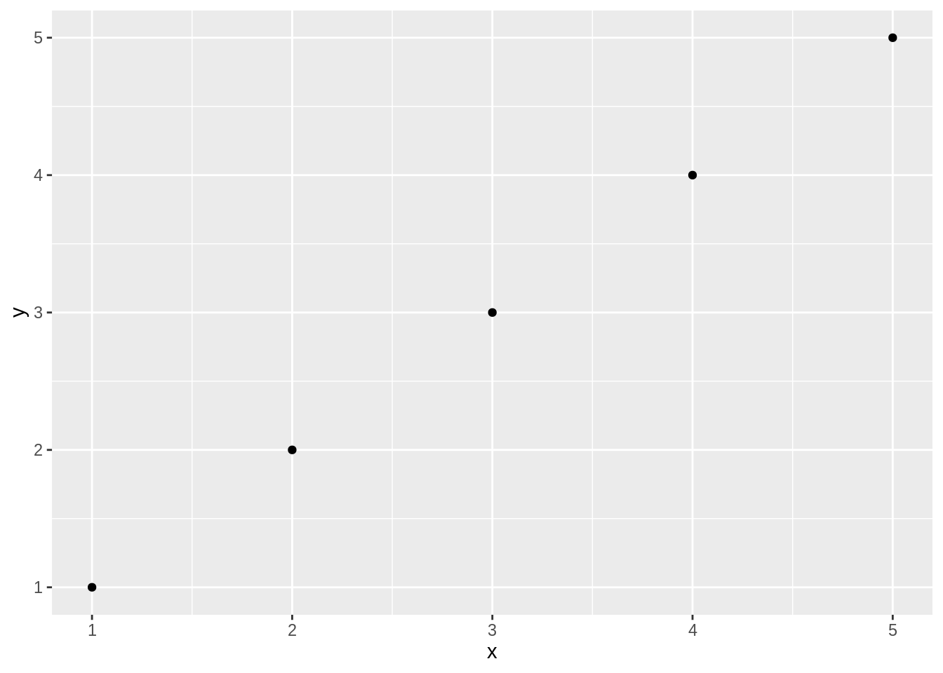 A scatter plot is used when you have paired observations: \((x_1, y_1), (x_2, y_2), \ldots, (x_n, y_n)\). It’s associated with a question: Is there a relationship between X and Y? We can plot the data by calling ggplot, passing in the data frame, and invoking a geometric point function: