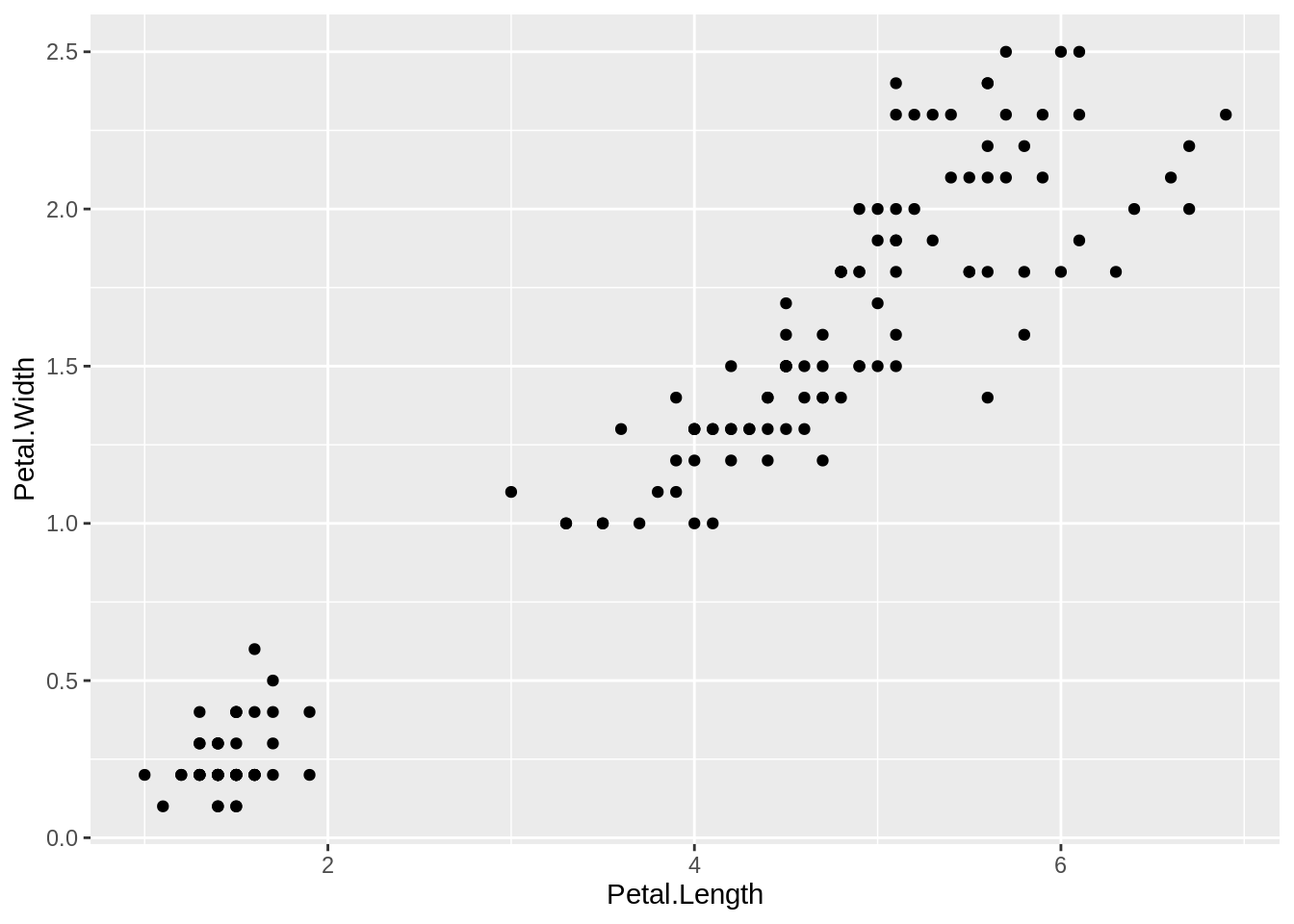Plotting with ggplot requires telling ggplot what data frame to use, then what type of graph to create, and which aesthetic mapping (aes) to use. The aes in this case defines which field from iris goes into which axis on the plot. Then the command geom_point communicates that you want a point graph, as opposed to a line or other type of graphic.