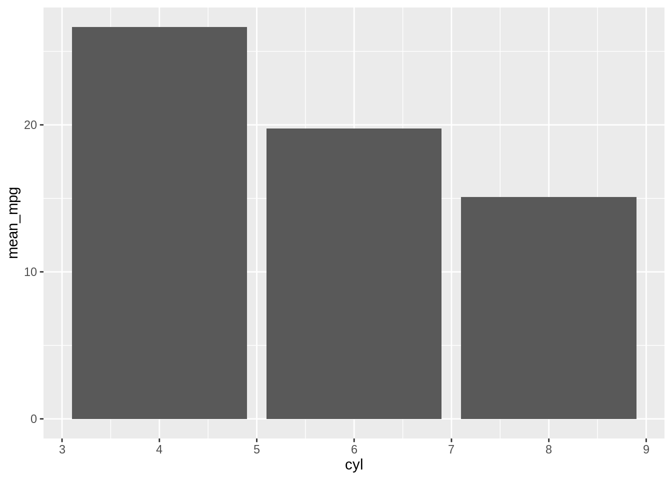 Alternatively, you can use geom_bar() to create the bar chart with the y-axis displaying mean_mpg, but you will need to set additional arguments in the geom_bar() function.