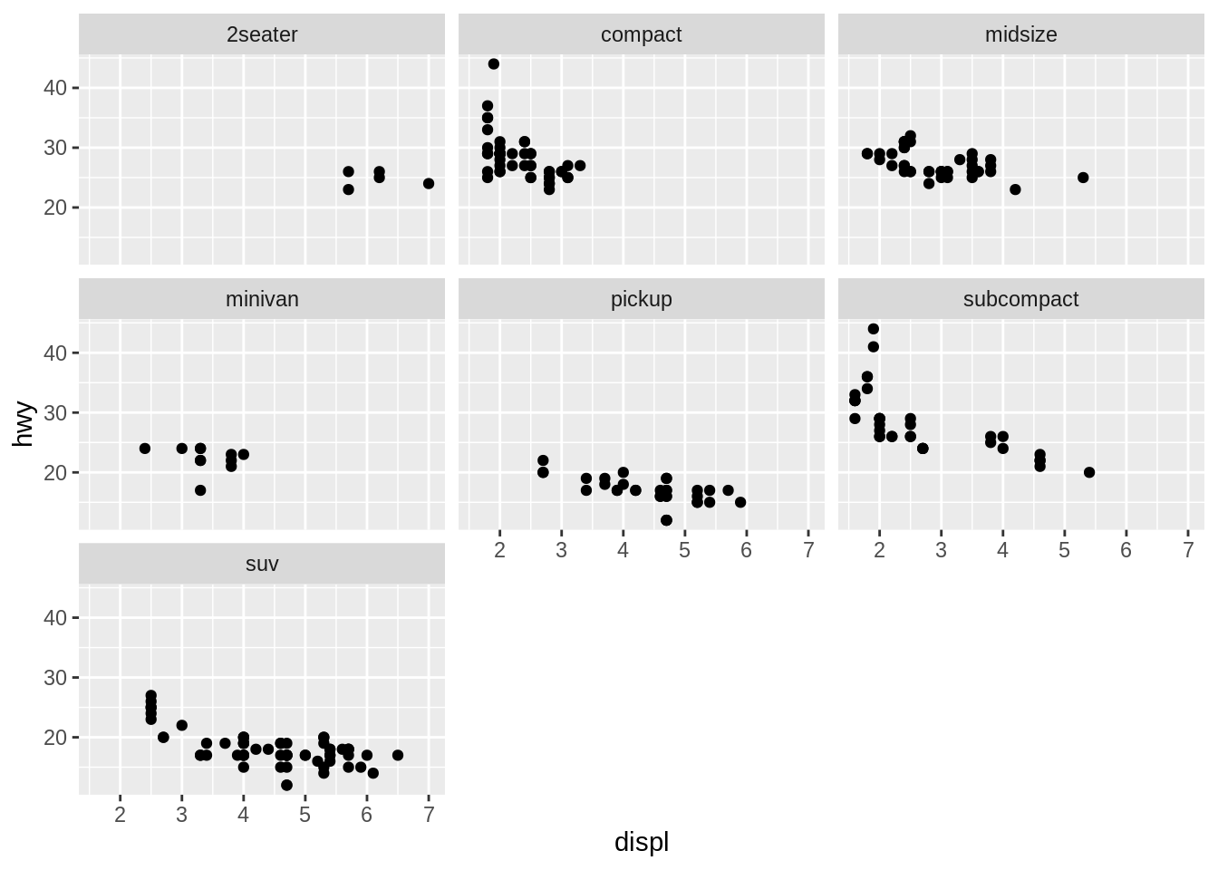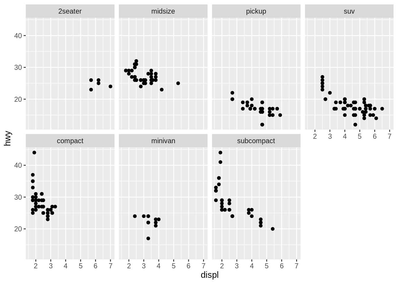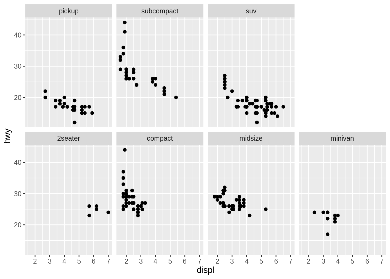 facet_wrap() makes a long ribbon of panels (generated by any number of variables) and wraps it into 2d. This is useful if you have a single variable with many levels and want to arrange the plots in a more space efficient manner. It takes the name of a variable preceded by ~.