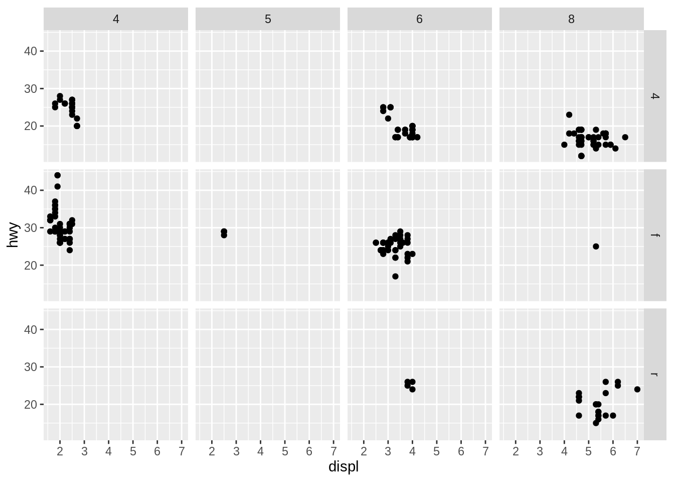 You can use multiple variables in the rows or columns, by “adding” them together, e.g. a + b ~ c + d. Variables appearing together on the rows or columns are nested in the sense that only combinations that appear in the data will appear in the plot. Variables that are specified on rows and columns will be crossed: all combinations will be shown, including those that didn’t appear in the original data set: this may result in empty panels.