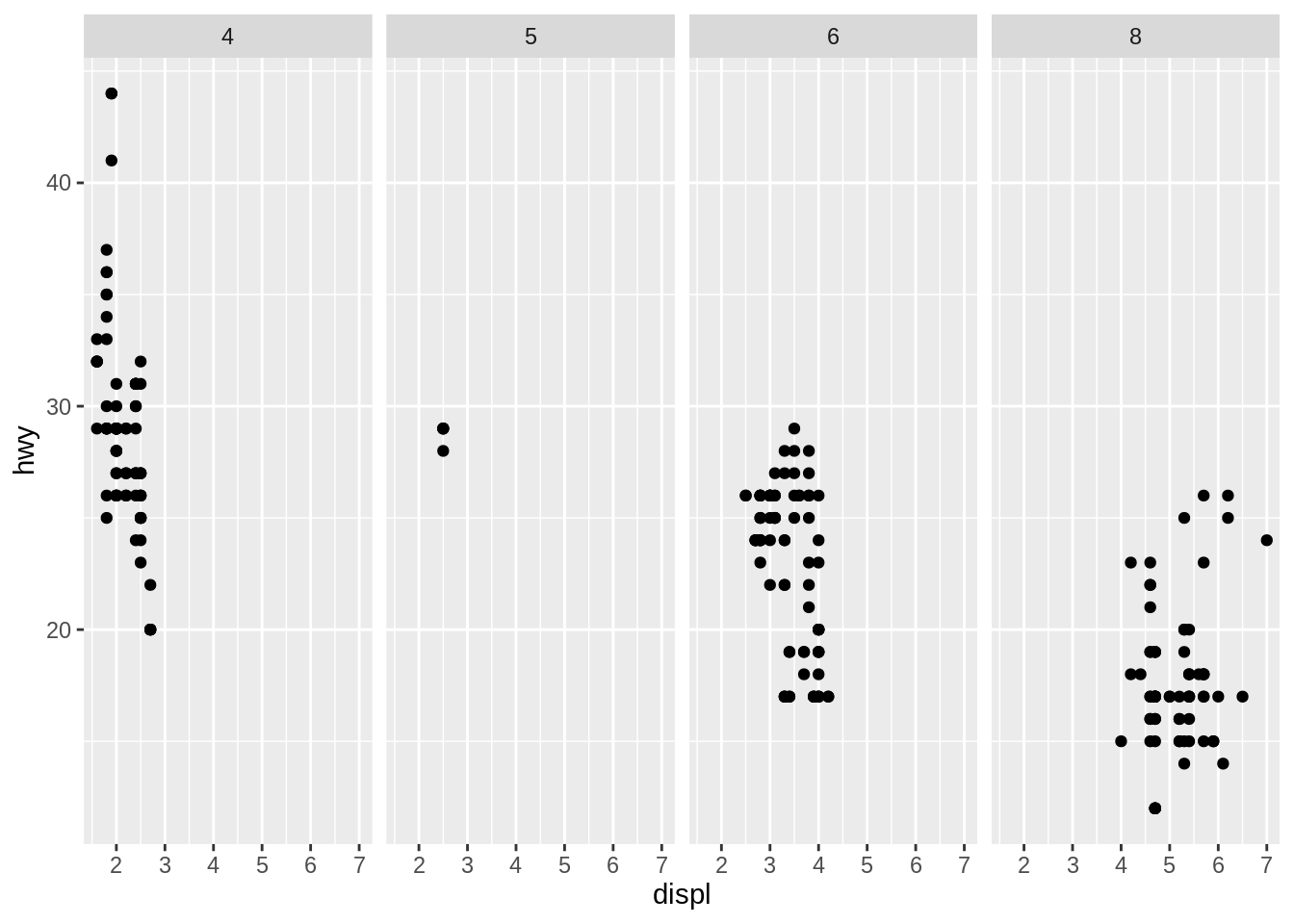 a ~ bspreadsaacross columns andbdown rows. You’ll usually want to put the variable with the greatest number of levels in the columns, to take advantage of the aspect ratio of your screen.